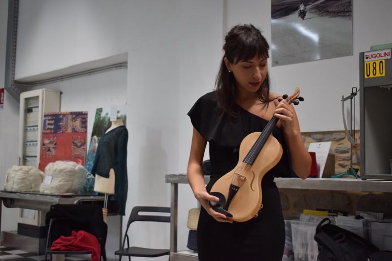 Progettato e realizzato da Luca Alessandrini questo violino è costituito da seta, il tessuto che solitamente vestiamo e da bioresina con impregnanti e indurenti che hanno consentito la realizzazione dell’intera cassa armonica.